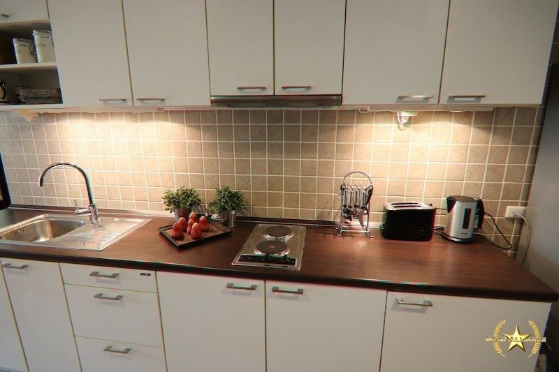 - Open plan living room and modern European-style kitchen.