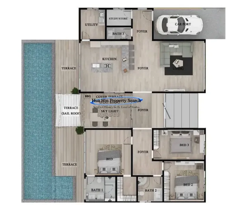Nestled in a small and exclusive residential enclave off Soi 112, just moments from the scenic Pineapple Valley Golf Course, this contemporary 3-bedroom, 2.5-bathroom pool villa offers modern elegance, privacy, and exceptional comfort on a large land plot.